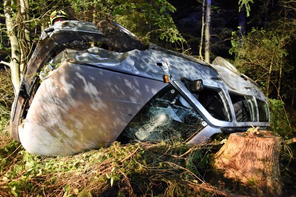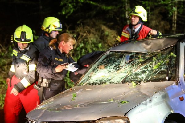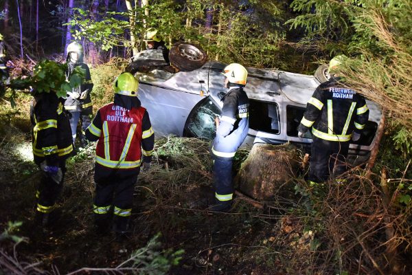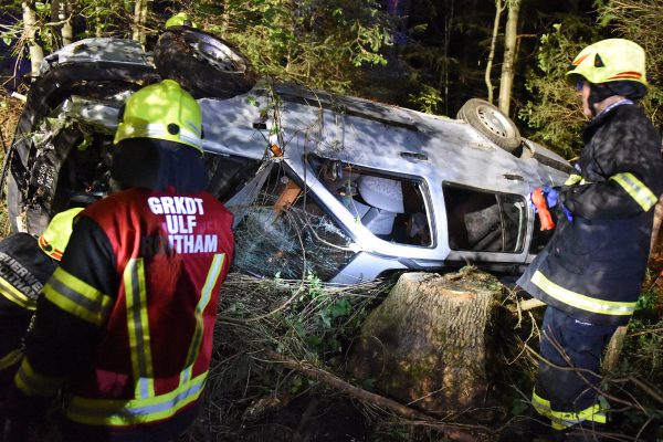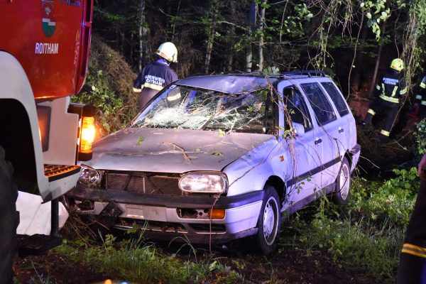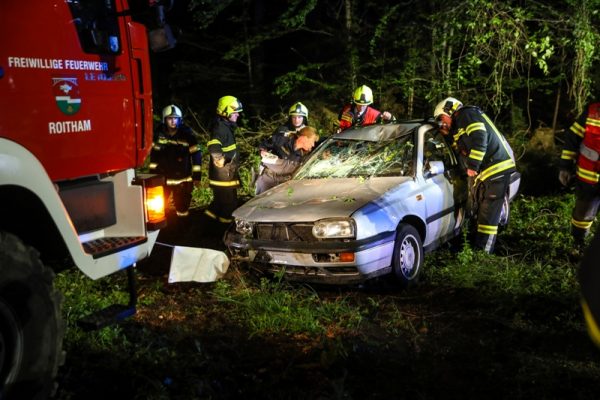 Ein schwerer Verkehrsunfall ereignete sich am späten Samstagabend auf der Gmundener Straße zwischen Roitham am Traunfall und Laakirchen. Ein Autofahrer war von der Straße abgekommen und gerade aus über eine Verkehrsinsel in den Wald gerast.
