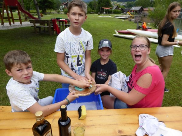 Auch am Samstag hielt nichts die Kinder davon ab, im und am Wasser zu spielen. Die Wassersportgeräte waren im Dauereinsatz und ein paar mutige Mädels wagten sogar den Sprung vom drei Meter Brett in den doch schon 14°C „warmen“ See. Zu Mittag wurde gemeinsam gekocht und anschließend das Sonnwendfeuer für den Abend vorbereitet. Die verbleibende Zeit wurde dazu genutzt, um sich gegenseitig besser kennenzulernen. Auch das Abendessen wurde gemeinsam zubereitet. Es war sehr schwierig genug Aufgaben für die vielen fleißigen helfenden Hände zu finden, da jeder seinen Beitrag leisten wollte. Am Abend traf eine Vielzahl an Eltern und Geschwister im Strandbad ein, um sich gemeinsam mit ihren Schützlingen das Große Feuer am Zlambach Eck anzusehen.