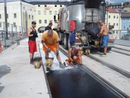 Mittlerweile erfolgte die beidseitige Montage der Fahrleitung auf der Brücke und durchs Trauntor, wofür teils bis in die Nacht hinein gearbeitet wurde um tags darauf den Platz auf der Brücke für die Maschinen der Asphaltierer frei zu haben. Eine Woche früher als geplant konnte nämlich auch schon mit der Asphaltierung begonnen werden. Bereits fertig asphaltiert wurde der hellgrau eingefärbte Fahrradstreifen, der sich nun deutlich von Fahrbahn und Gehweg unterscheiden wird. Weiter ging es dann auch schon mit Teilen des Fahrbahnbelags und dem Bereich zwischen den Schienen. Immer wieder faszinierend zu beobachten, wie der Gussashalt auch heutzutage noch immer in mühevoller Handarbeit eingebaut wird – Respekt, was die Männer hier leisten!