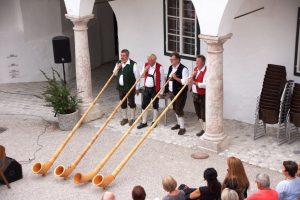 In gewohnter Manier begleitete Mag. Hubert Schmiedhuber als Moderator durch den Abend. Das Motto des heutigen Abends lautete die Note. Den Beginn machte aber nicht die Stadtkapelle, sondern die ersten musikalischen Klänge kamen von der Balustrade durch die 4 Alphörner des Vöcklataler Langholzes, die dann auch beim Stück „Almentag“ gemeinsam mit der Stadtkapelle die Zuhörer begeisterten.