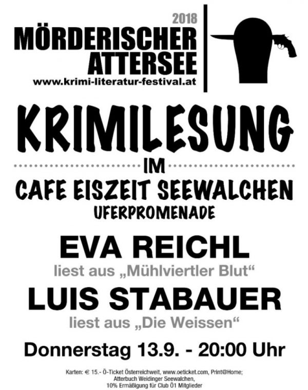 Am 13. September liest Luis Stabauer mit Eva Reichl im Rahmen „Mörderischer Attersee“ und wird dabei seinen neuen Roman „Die Weißen“ vorstellen.