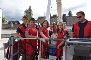 Die technikbegeisterten Mädchen, aber auch der Hahn im Korb, konnten viele technische Details erfahren, aber auch die vielfältigen Einsatzmöglichkeiten des Gerätes. Natürlich durfte auch eine Fahrt in luftige Höhe nicht fehlen, wobei so manchem dabei schon etwas mulmig wurde.