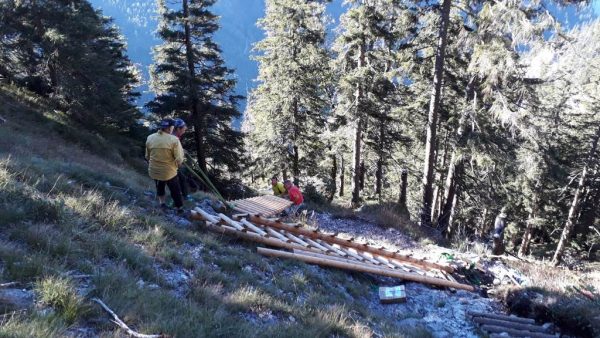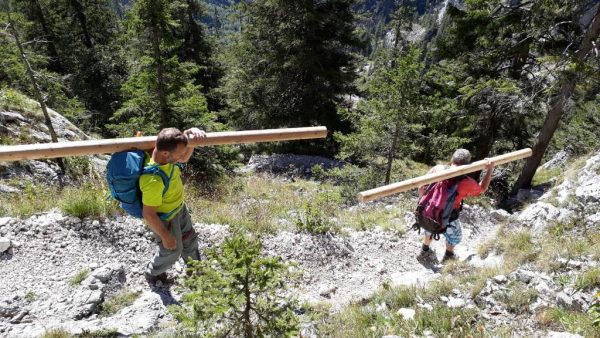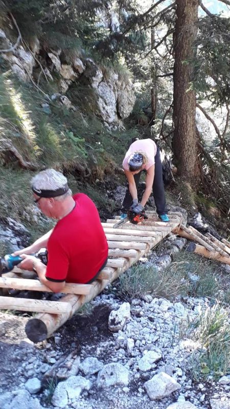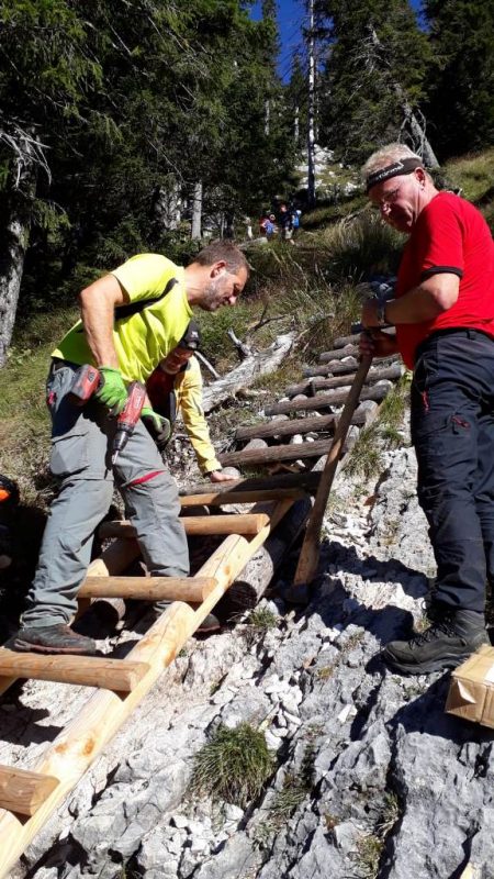 Dank der perfekten Mannschaft rund um Christian Rittenschober waren die Arbeiten schnell erledigt. Die neuen Leitern befinden sich im unteren Drittel des Steiges und im Zuge der Montage wurden gleich auch noch einige kaputte Stufen mit neuen Rundlingen ausgebessert – eine schweißtreibende Angelegenheit, die ganzen Einsatz fordert. Erschwerend bei der Wartung alpiner Steige kommt immer hinzu, dass sämtliche Gerätschaften wie Bohrmaschinen, Motorsägen, Akkus, Flex etc. ebenfalls aufgetragen werden müssen. Ein Lob an die starken Damen und Herren, die dafür sorgen, dass unsere Wege in einem einwandfreien Zustand sind.
