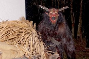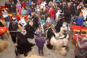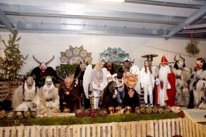 Gegen 19:00 Uhr wurde es dann gruselig. Die finsteren Gestalten der Nacht, die WARTENFELSER TEUFELN aus Thalgau betraten die Szene. Sie schauen wohl furchterregend aus, machten auch einen Höllenlärm, zeigten aber dann ihre friedliche Absicht und waren zum Greifen nahe. Die Besucher groß und klein verloren ihre Furcht und konnten die finsteren Gesellen ganz aus der Nähe betrachen und befühlen. Engel und Nikolaus betrachteten das Geschehen von der Bühne aus.