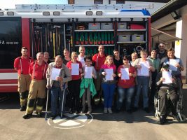 Beim Hauptteil „Was tun wenn’s brennt?“ wurde aufmerksam zugehört, um anschließend selbst Hand anzulegen und mit Feuerlöschern am Lösch-Trainer die zu bekämpfen. Der Nachmittag wurde mit der Urkundenüberreichung abgeschlossen.