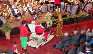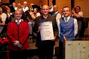 Klaus Pesendorfer wurde eine große Anerkennung zuteil, ihm wurde nach 26 jähriger Tätigkeit als Kapellmeister der Ehrenkapellmeister verliehen. Zum Schluss schaute noch der Weihnachtsmann vorbei und wünschte den Zuhörern eine schöne Adventszeit.