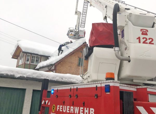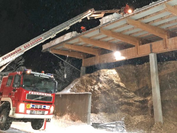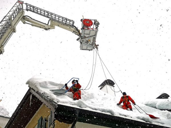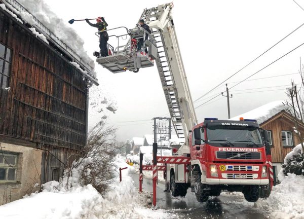 Vielfach stand die FF Bad Goisern am 12. und 13. Jänner auch im Einsatz, um gefährdete Hausdächer wieder von den großen Schneelasten zu befreien. Fachkundige Statiker beurteilten das jeweilige Gefährdungspotential an den Gebäuden und lieferten so wichtige Entscheidungshilfen für die Einsatzkräfte. Entsprechend gesichert am Hubsteiger, Kran oder Kletterseil mussten dutzende Dachflächen von den Feuerwehrmännern abgeräumt werden. Mit dem eigenen Feuerwehr-Radlader mussten sogar enge Straßen erst ausgeräumt werden, um beispielsweise den Hubsteiger aufstellen zu können. Erst mit dem Nachlassen der Niederschläge und einer Wetterbesserung kamen auch die Feuerwehrmänner wieder etwas zum Durchschnaufen.