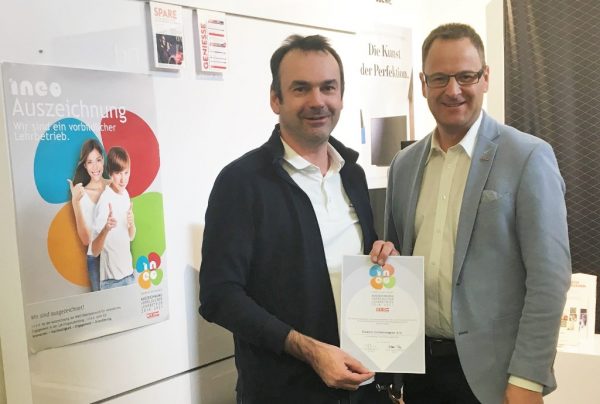 Roland Lichtenwagner und sein Team wurden erstmals von der Wirtschaftskammer Oberösterreich mit dem ineo-Gütesiegel als vorbildlicher Ausbildungsbetrieb ausgezeichnet. Martin Ettinger (Obmann der WKO Bezirksstelle Gmunden) überreichte die Auszeichnung.