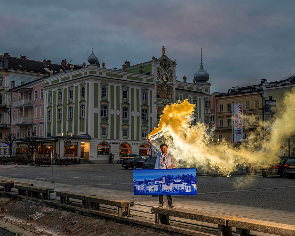 Seit mittlerweile fünf Jahren inszeniert der in Gmunden aufgewachsene Künstler Matthias Kretschmer seine Werke im Form von Kunst-Performances, Anlass sind neben anstehenden Ausstellungen und Vernissagen auch aktuelle gesellschaftliche Ereignisse, die Kretschmer in Form von Aktionen und Fotoshootings symbolisch aufarbeitet. So auch vergangene Woche in der Jugendstadt des Künstlers.