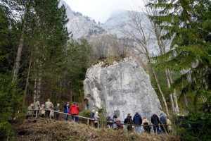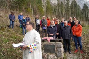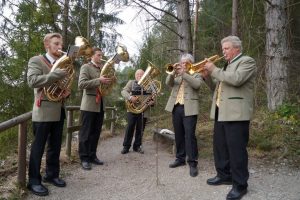 Die Gedenkmesse wurde wieder von Pfarrassistent Gerhard PUMBERGER in sehr persönlicher Weise abgehalten und regte viele Anwesende zum Nachdenken und „in sich gehen“ an. Zum Zeichen der Zusammengehörigkeit wurde Brot in die Runde gereicht und gemeinsam verspeist. Seine Worte umfassten Freude, Leidenschaft, Mut und auch Verzweiflung und Wut, die mit dem Bergsteigen verbunden sind. Freude und Mut für die Ausübung dieser Leidenschaft und Verzweiflung und Wut bei den tragischen Geschehnissen, die leider auch vorkommen. Auch Bürgermeister Stefan KRAPF erwähnte dies in seinen Worten zur Gedenkfeier. Manfred SPITZBART und Christoph MIZELLI, Herausgeber des Buches „MYTOS TRAUNSTEIN“, lasen ein paar Gedanken aus diesem Meisterwerk. Musikalisch trug eine Abordnung der Werkskapelle Laufen in sehr stimmiger Weise zur Feierstunde bei. Mit zwei Strophen HOAMATLAND endete die Stunde unter Stein.