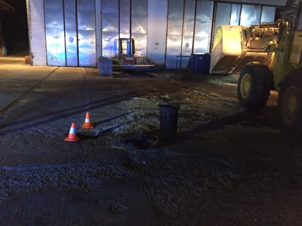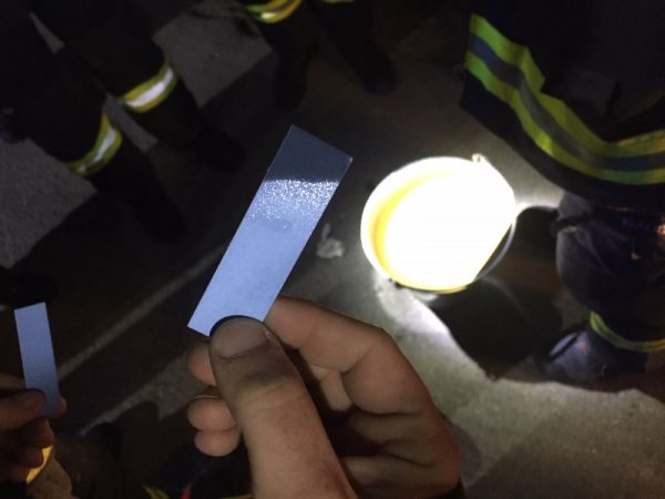 Sofort wurde die Einsatzstelle ausgeleuchtet und erste Proben vom Medium genommen. Parallel dazu wurde das mehrseitige Stoffdatenblatt durchgearbeitet. Ebenso wurden diverse Tests mit Proben durchgeführt. Zum Glück war der Stoff nahezu ph-Neutral und auch nicht direkt aggressiv.
