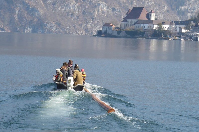 Der von der Familie Hoff gespendete Baum war in Traunkirchen abzuholen und dazu bot sich der Seeweg nach Gmunden an. Mit vereinten Kräften wurde der Baum ans Seeufer gebracht um anschließend per Motorboot zur Slipanlage des Segelclubs in Gmunden gezogen.