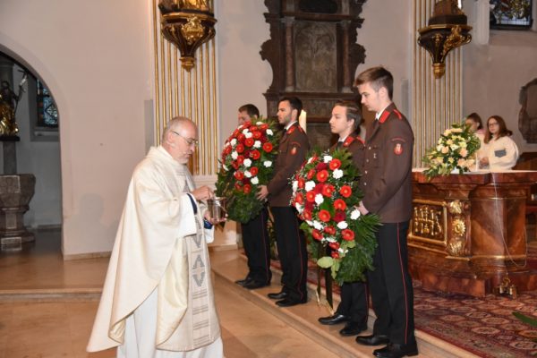 Da das Wetter eine Kranzniederlegung am Kriegerdenkmal nicht zu ließ, erfolgte die Weihe der Kränze in der Kirche durch Pfarrer Franz Trinkfaß.