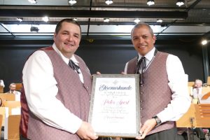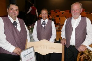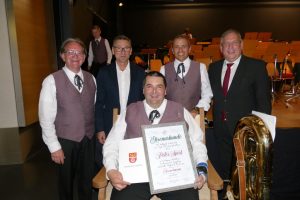 Ins gleiche Horn blies Bürgermeister Ing. Fritz Feichtinger, der dem Jubilar das Silberne Ehrenzeichen der Stadtgemeinde Laakirchen verlieh. Die Musiker mit Tischlermeister Franz Attwenger & Söhne überreichten Peter Sperl den richtigen „Musi-Stuhl“ (Eiche/Zirbe), mit welchem Peter Sperl gleich im Publikum Platz genommen hat. Er hörte sich eine Uraufführung an: den „Peter-Sperl-Marsch“, komponiert von Kons. Karl Altmanninger. Ein genialer Marsch, den die Stadtkapelle heuer beim Marschmusikwettbewerb in Pinsdorf (1. Juni 2019, ab 17.00 Uhr, Fußballplatz Pinsdorf) zum Besten geben wird. Frank Sinatra Classics, gesungen von Florian Schatzl (Mozarteum Salzburg) bildete das Schlussstück des Frühjahrskonzertes. Die Musiker gratulieren nochmals den Solisten sowie dem geehrten Peter Sperl mit Dank und Anerkennung für seine Stadtkapelle Laakirchen!