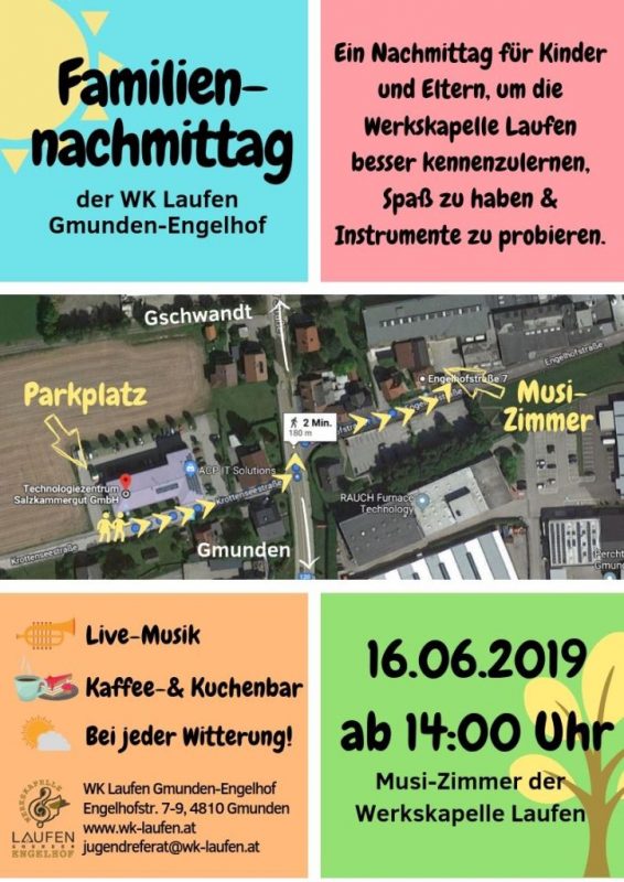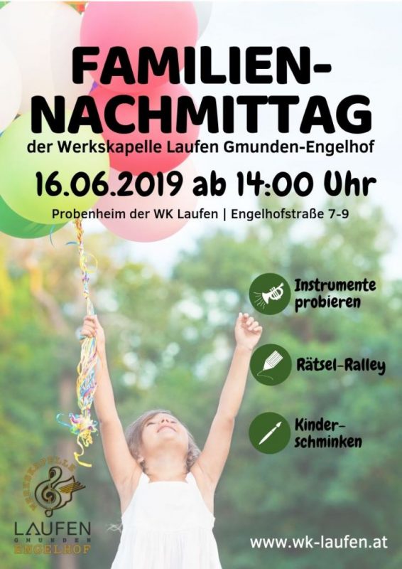 Von den musikalischen Fortschritten des aktuellen Nachwuchses können sich Gäste direkt vor Ort beim Auftritt des Jugendorchesters überzeugen, danach können in Form eines Stationenbetriebs zehn verschiedene Instrumente selbst ausprobiert werden. Während sich die Kleinen bei Instrumentenfindung, am Rätsel- und Maltisch oder beim Kinderschminken unterhalten, steht für die großen Gäste eine Kaffee- und Kuchenbar bereit. Die Ansprechpartner des Jugendreferats stehen dabei für alle Fragen rund um das Erlernen eines Instruments zur Verfügung (jugendreferat@wk-laufen.at). Die Veranstaltung findet bei jeder Witterung statt, bei Schönwetter zusätzlich mit Live-Musik und Gastgarten-Feeling im Freien.