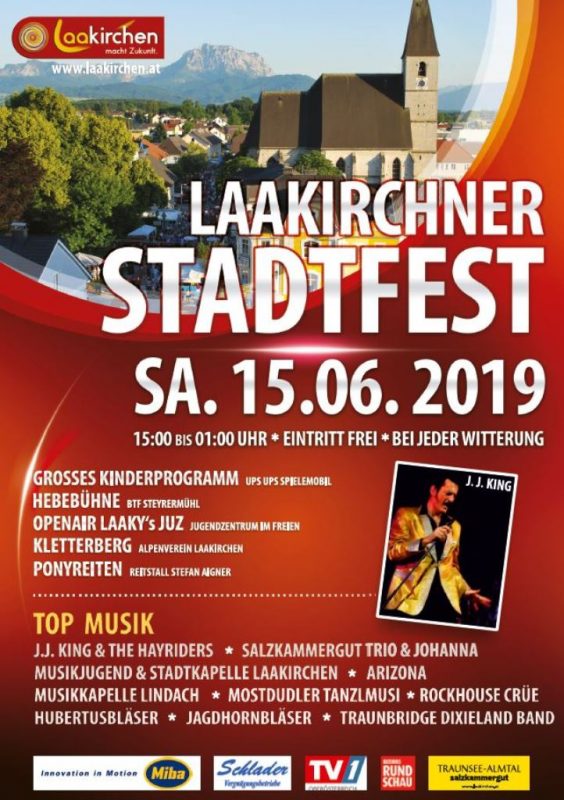 Am Samstag, dem 15. Juni 2019 laden die Stadtgemeinde, Laakirchner Vereine und Wirtschaftstreibende zum Stadtfest ein. Gefeiert wird ab 15 Uhr im Ortszetnrum mit viel Musik, abwechslungsreicher Kulinarik und großem Familienprogramm.