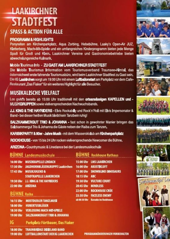 Ab 15 Uhr geht’s los mit ortsansässigen Musikkapellen und –gruppen sowie vielversprechenden Nachwuchsbands. Später sorgen J.J. King & The Hayriders, das Salzkammergut Trio & Johanna, Arizona und viele weitere Bands für ausgelassene Stimmung. Ob Rock’n Roll, Countrymusic oder Evergreens – mit dieser Musik wird das Tanzbein geschwungen. Weitere Hotspots sind die Karibikparty mit 90er Jahre Musik am Kirchenplatz und die Rockhouse-Bühne vor dem Rathaus.