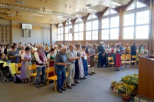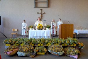 Traditionsgemäß wurde am Donnerstag, 15.8.2019 in Gschwandt zu Maria Himmelfahrt eine Messe mit Kräuterweihe gefeiert. Die Goldhauben-, Kopftuch- und Hutgruppe Gschwandt war in den letzten Tagen äußerst fleißig und banden wunderschöne Kräuterbüscherl und bereiteten auch unzählige Bauernkrapfen für nach dem Kirchgang, der wegen Renovierung der Pfarrkirche Gschwandt in der Mehrzweckhalle stattgefunden hat, vor. Wegen Krankheit von KonsR Alois KAINBERGER wurde die Harmonikamesse von Michael MIGLBAUER durch Pfarrassistentin Anna-Maria MARSCHNER abgehalten.