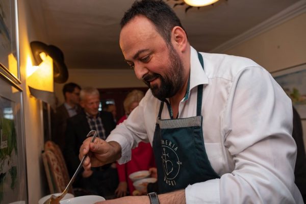 Mag. Volkher Kaltenböck „Brauerei Hoangarten“ eröffnete die Ausstellung zusammen mit Bürgermeister Dipl. Ing. Walter Kastinger – während der Künstler selbst das Holzfass zapfte. „A kleines Fest“ nannte er die Veranstaltung mit über 90 Personen direkt am Attersee und eröffnete mit Spitzenkoch Backi „Pescheria Backi Salzburg“ den ersten Gang mit Fischsuppe.