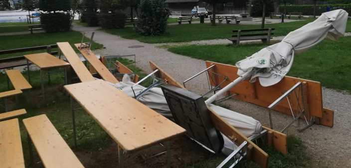 Umgeworfene Biertische, Bänke und Schirme vor seiner Fischbrathütte, fand der Betreiber eines Fischgrills Samstagmorgen in Gmunden. „Das war wohl der Alkohol, würde gerne alle Beteiligten auf ein Bier und eine Therapiestunde einladen…“, postete er via Facebook.