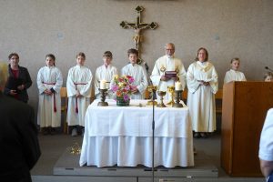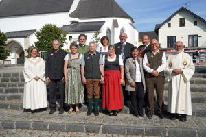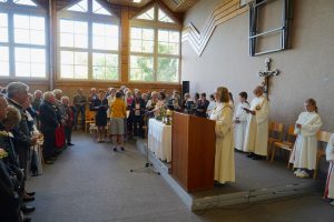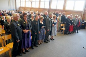 Anschließend marschierte die Feiergesellschaft unter Begleitung von Pfarrassistentin Anna Maria MARSCHNER und Pfarrer KonsR. Kan. Franz HAIDINGER aus Ebensee/Traunkirchen (er nahm den Weg trotz vieler Termine in seiner Gemeinde auf sich und vertrat Pfarrer Alois KAINBERGER, der momentan gesundheitlich noch fehlt) zur gemeinsamen Messfeier in die bis auf den letzten Platz gefüllte Veranstaltungshalle. Für musikalischen Hochgenuss sorgte der Kirchenchor Gschwandt unter Leitung von Annemarie HAUER. Für die äußerst feierliche Gestaltung der Messe mit passenden Worten von Pfarrer SENGSCHMID und den Liedern des Kirchenchors gab es am Ende kräftigen Applaus.
