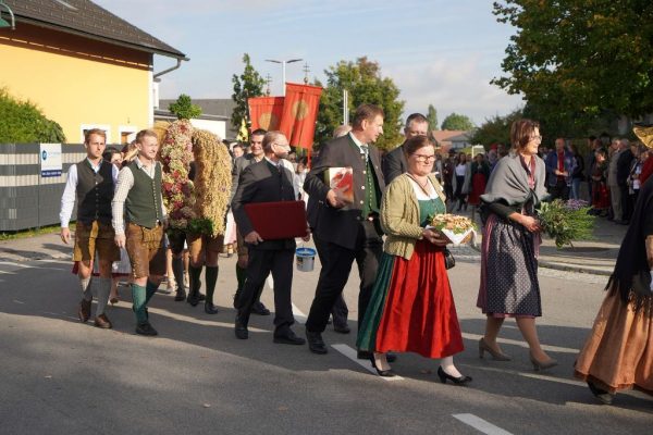 Der Festtag hat mit einem Erntedankumzug vom Feuerwehrdepot in die Pfarrkirche begonnen. Die wunderschöne Erntekrone, angefertigt von der Landjugend Gschwandt wurde in Begleitung der Musikkapelle Gschwandt, der Goldhaubengruppe Gschwandt, den Kindergartenkindern, Pfarrassistentin Anna-Maria MARSCHNER, Pfarrer KonsR Alois KAINBERGER, Pfarrer Alois PALMETSHOFER mit den Ministranten und einer große Schar an Kirchgängern in die Pfarrkirche getragen und vor dem Altar abgestellt. Die heilige Messe war von vielen Danksagungen und Segnung der mitgebrachten Erntegaben geprägt und wurde musikalisch vom Kirchenchor und einer Abordnung der Musikkapelle Gschwandt begleitet.