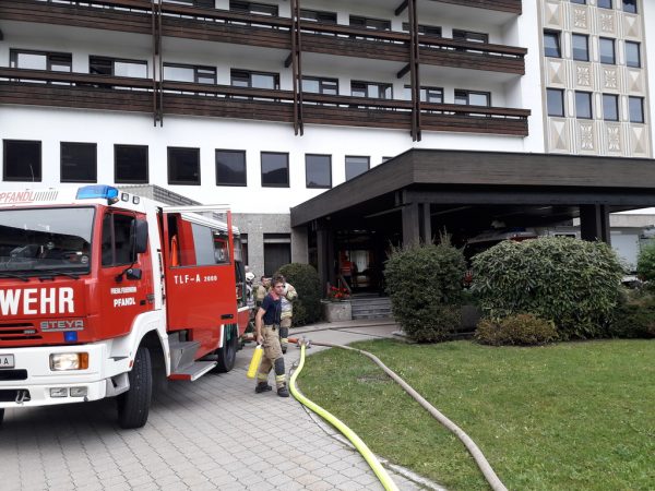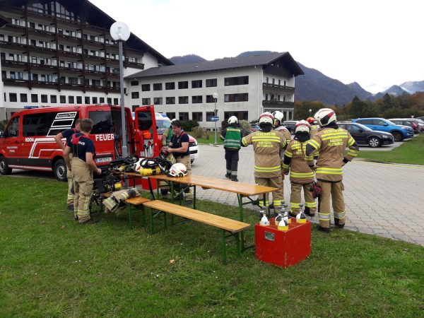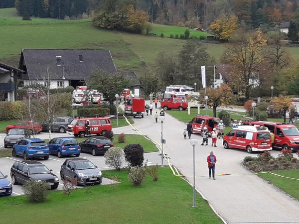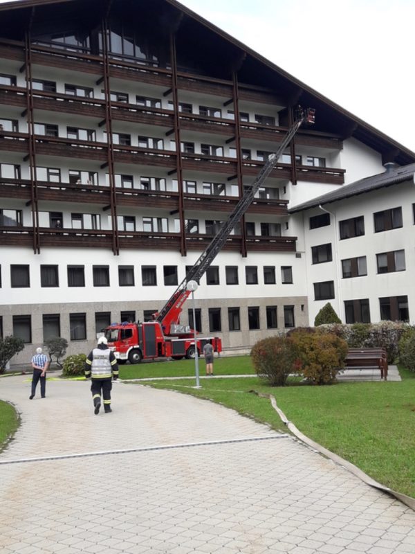 Umgehend wurde zum Brandobjekt ausgerückt. Sofort nach dem Eintreffen, begann der Gruppenkommandat von Tank Pfandl, mit der ersten Lageerkundung. In Verbindung mit den anwesenden Brandschutzbeauftragen wurde ein Brand im 5. Obergeschoss lokalisiert. Über eine genaue Anzahl der vermissten Personen konnte keine Auskunft gegeben werden. Somit wurde umgehend der Pflichtbereichsalarm für die restlichen acht Ischler Feuerwehren und Feuerwachen ausgelöst.
