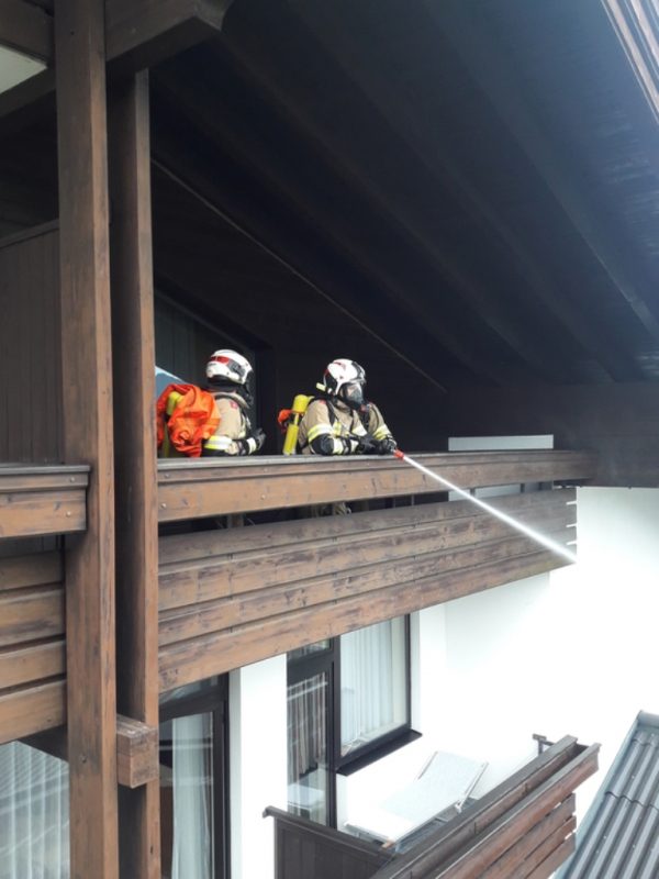 Durch die anwesenden Tanklöschfahrzeuge wurden die im Gebäude befindlichen Steigleitungen gefüllt und die ersten Atemschutztrupps zur Personenrettung bzw. Brandbekämpfung ins Obergeschoß entsandt.