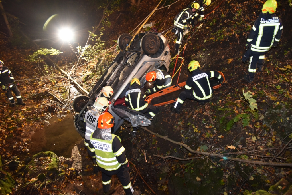 Nun begann ein perfektes Zusammenspiel der FF Einsatzkräfte beider Wehren: Fahrzeug sichern, Beleuchtung aufbauen, Gerätschaften in den steil abfallenden Grabe bringen – aber immer mit dem Gedanken der Eigensicherung im Hinterkopf.