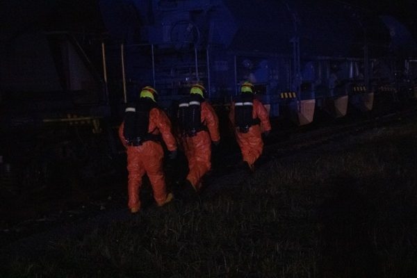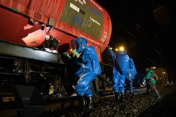 Um 23:35 Uhr wurde das Gleis Strom los geschalten und der Erkundungtrupp in Schutzstufe 2 konnte mit dem eruieren des Beschädigten Wagons beginnen. Der Wagon wurde begutachtet und das darin Befindliche Gefahrengut, wobei es sich um Chlor Wasserstoffsärure (Salzsäure) handelte, ermittelt.