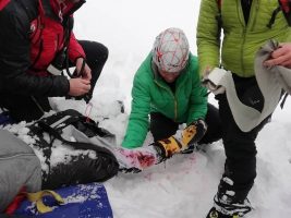 3. Erste Hilfe Station: Bergung und Erstversorgung eines Verunglückten (geschminktes Opfer mit stark blutender Wunde)