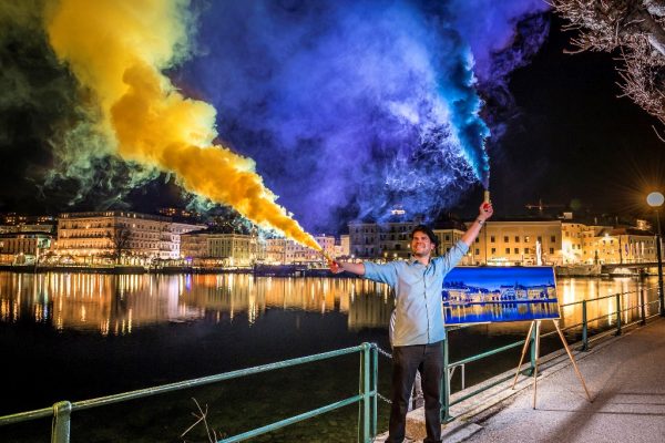 Eben diesen Gegensatz stellte Matthias Kretschmer mit einer neuerlichen Kunst-Performance nach, die Dunkelheit der Nacht, die durch die beleuchteten Fassaden der Gmundner Innenstadt durchbrochen wird war die Kulisse, in welche das Fotoshooting eingebettet wurde. Blaue und Gelbe Rauchfackeln verliehen dem Gesamtbild die nötige Dynamik, den Hauch von Gold und Wärme, der sich über die Nacht am Traunsee legte und somit ein erster Vorbote der warmen Jahreszeit ist. Das inszenierte Gemälde „Panorama“ ist der persönliche Eindruck des Künstlers an Gmunden , die symbolische, oftmals erfahrene Wärme der Heimatstadt, eingefangen als Momentaufnahme in Blau und Gold.