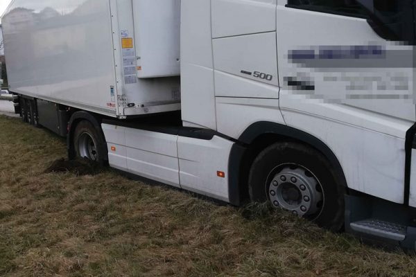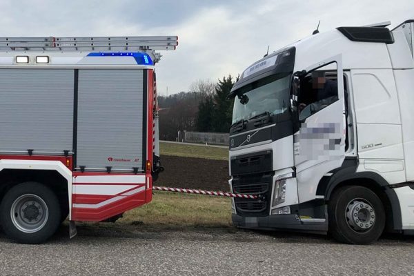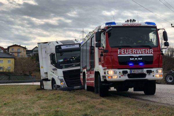 Parallel zum Ölspureinsatz musste ein Sattelzugfahrzeug samt Auflieger auf der Zufahrt zum Gasthof Ehrenfeld geborgen werden. Auch hier führte ein Fahrfehler dazu. Für das Schwerfahrzeug mit 10 Tonnen Ladung gab es kein Vor- und Zurück mehr. Die Bergung wurde von unserem Löschfahrzeug mit einer Abschleppstange durchgeführt.