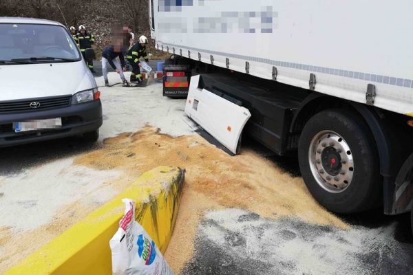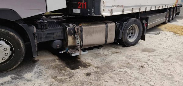 Bei Eintreffen der Feuerwehr wurde sofort ein dreifacher Brandschutz aufgebaut und Ölbindemittel ausgestreut. Mit einer kleinen Kraftstoffpumpe wurde der noch im Tank befindliche Diesel, ca. 400 Liter, in mehrere Kunststofffässer umgepumpt. Um weiteren Fahrbahnverschmutzungen vorzubeugen, wurde eine kleine Auffangwanne mit einem Spanngurt unter die schadhafte Stelle behelfsmäßig montiert.