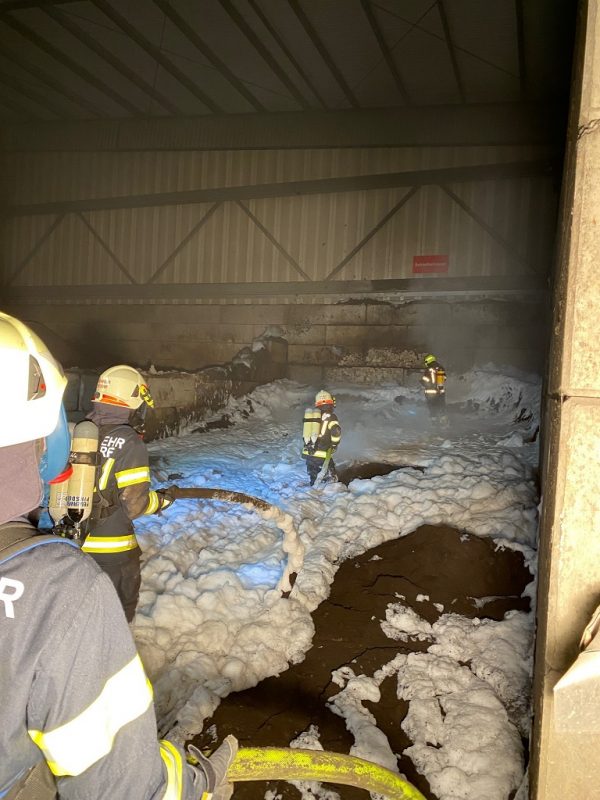 Eine Lageerkundung ergab die UN3190, ADR Klasse 4.2, wobei es sich um einen selbsterhitzungsfähigen anorganischen Stoff handelt, welcher leicht oder spontan entzündbar ist und bei Brand oder starker Erwärmung giftige und reizende Dämpfe entwickelt. Die Löschmaßnahmen wurden von den beiden Pflichtbereichsfeuerwehren mittels Schaum/Wasser durchgeführt. Die GSF Mannschaft begleitete die Maßnahmen durch Einsatzberatung, Gasmessungen und Wärmebildkontrollen.