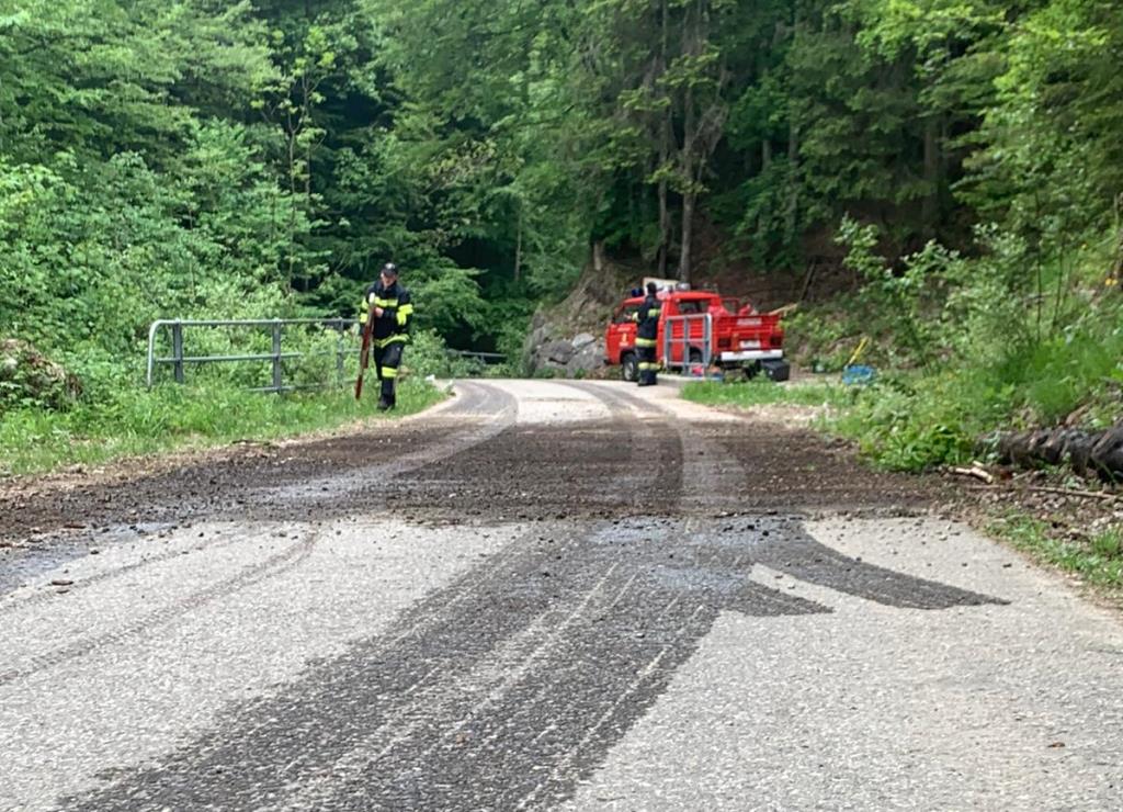 Dienstag, 19. Mai 2020. Ein Holztransporter verlor heute Mittag aus bisher unbekannter Ursache auf der Radgrabenstraße eine erhebliche Menge an Betriebsmittel. Um 12:37 Uhr wurden die Kameraden der Feuerwache Perneck mittels Funkmeldeempfänger, mit dem Alarmtext „Ölspur Radgrabenstraße“, von der OÖ Landeswarnzentrale alarmiert. Die freiwilligen Helfer der Feuerwache Perneck rückten daraufhin mit ihren zwei Fahrzeugen zum Einsatzort aus.