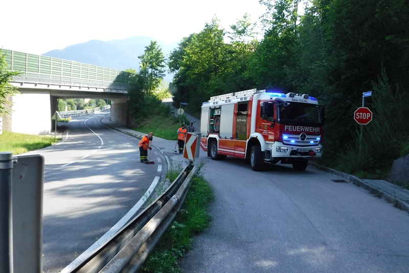 Speziell in den Kurven war die Verschmutzung enorm. Mit mehreren Säcken Ölbindemittel konnte die Fahrbahn nach einer guten Stunde gereinigt werden. Im Einsatz standen der Gemeindezug der Hauptfeuerwache mit drei Fahrzeugen und zwölf Mann, sowie eine Streife der Polizei Bad Ischl.