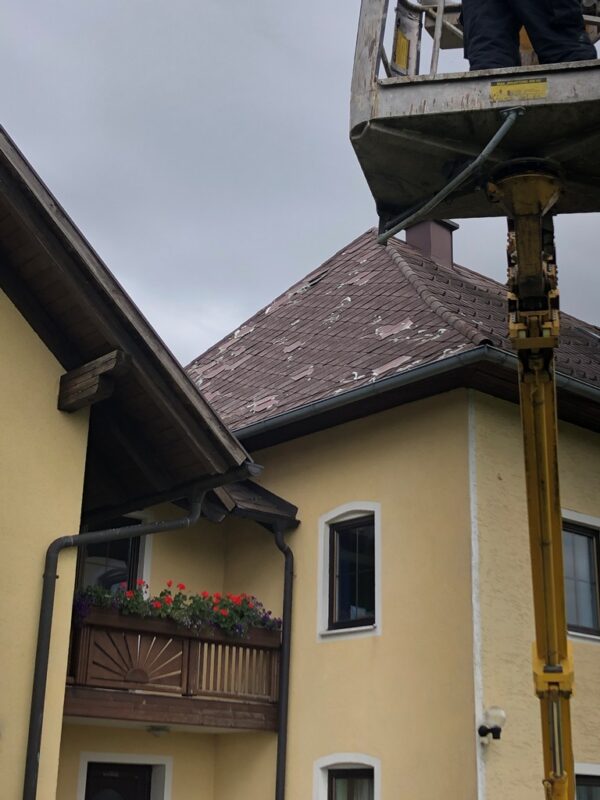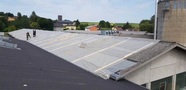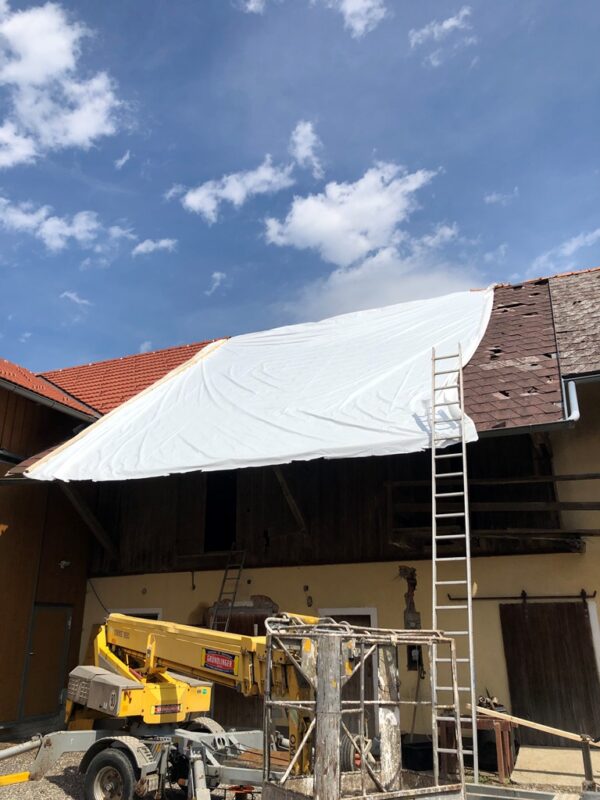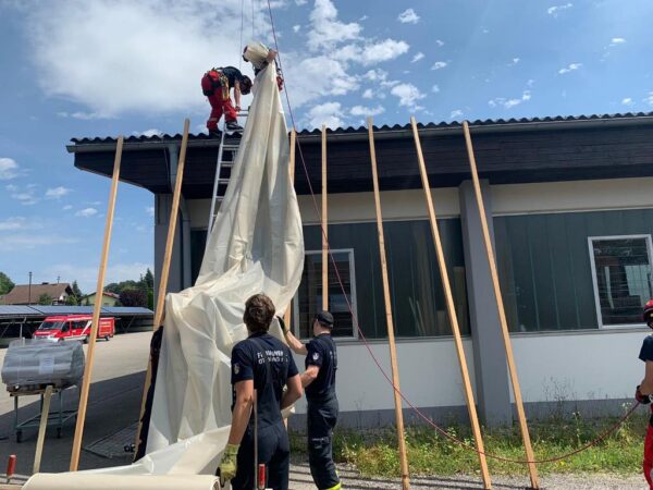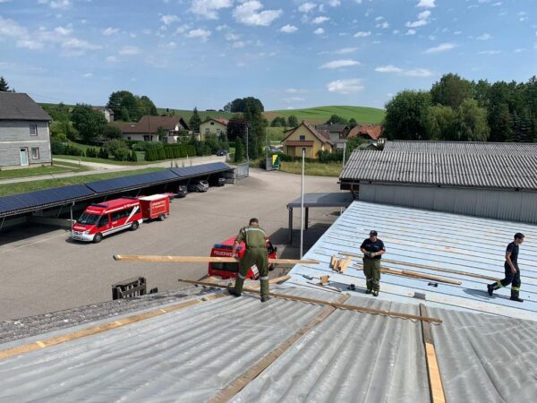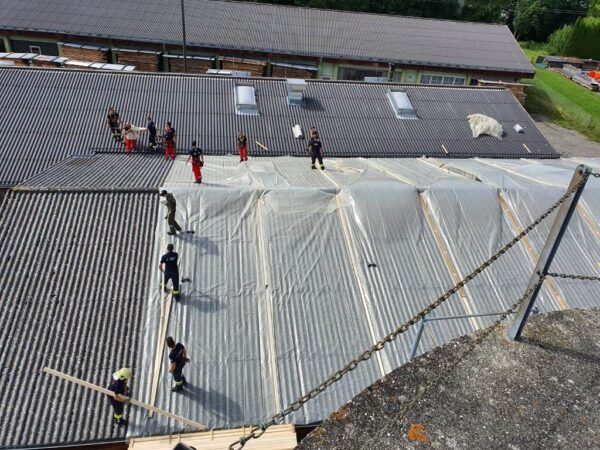 Am nächsten Tag, 29. Juli 2020, wurden wir zu weiteren Einsätzen alarmiert. In der Ortschaft Schachen wurden zwei Häuserdächer mit Planen, Pistolenschaum und Dachziegeln provisorisch repariert. Insgesamt standen 9 Mann mit 2 Fahrzeugen im Einsatz.