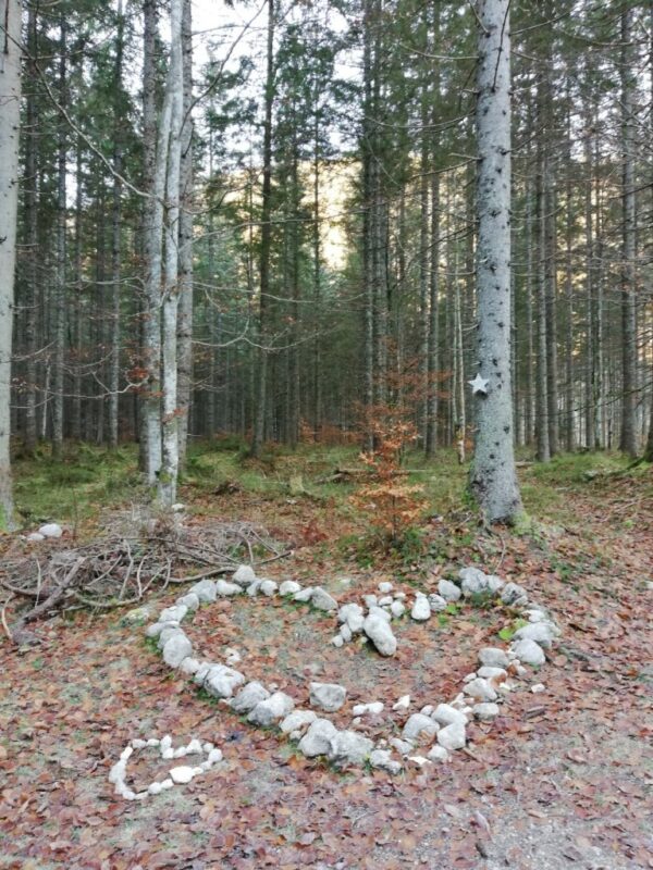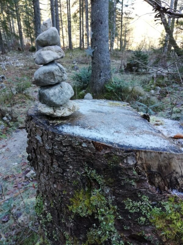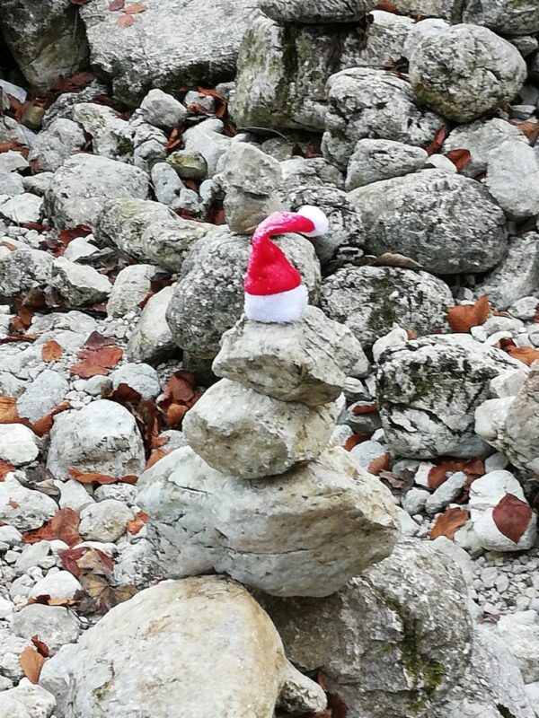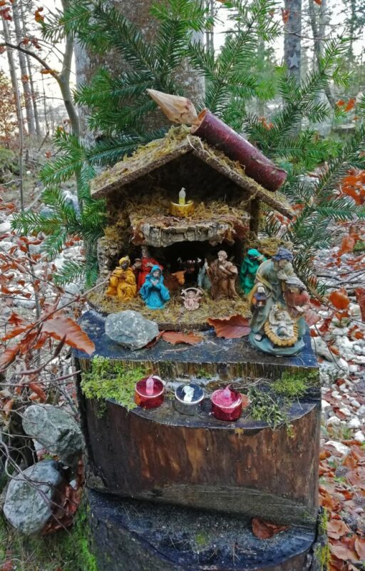 „Stoamandl“ verziert mit bunten Mützen, ein Herz aus Stein, Sterne an Bäumen und das absolute Highlight: eine liebevoll gestaltete Krippe auf einem Baustumpf.