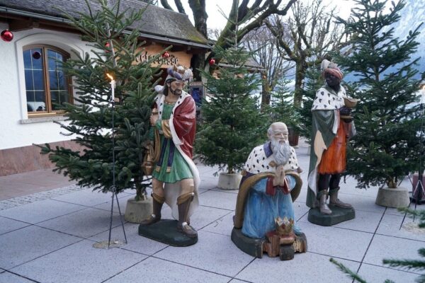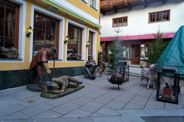 Fast das gleiche Bild in St. Wolfgang. Auch hier hatten die Organisatoren ganze Arbeit geleistet und hunderte Christbäume aufgestellt, dazwischen lebensgroße, handgeschnitzte und gefasste Figuren aufgestellt. Sanfte Advent,- und Weihnachtsmusik ertönte aus Lautsprechern und am See war die 17 Meter große und beleuchtete Laterne, das Wahrzeichen des St. Wolfgang Advent zu bewundern. In der Pfarrkirche konnte man schon die wunderschöne Krippe, in der natürlich noch einige Figuren fehlten und den berühmten Pacheraltar besichtigen.
