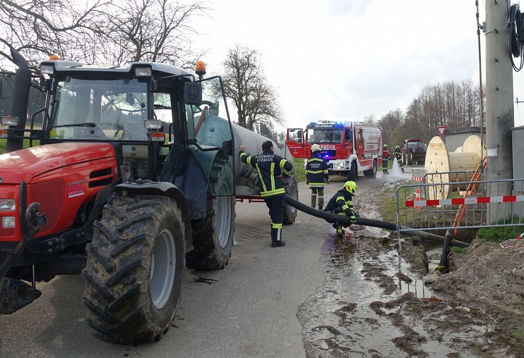 Die FF Atzbach wurde am 02. April um 16:43 Uhr von der Landeswarnzentrale zur Straßenreinigung nach einem Unfall mit einem Güllefass in die Ortschaft Oberapping alarmiert. Aus noch unbekannter Ursache löste sich während der Fahrt ein Rad, wodurch das Güllefass am Boden aufschlug und in weiterer Folge der Inhalt auslief.