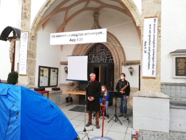 Musikalisch (Lukas und Lea Lahninger), mit Stille, aber auch mit nachdenklich-vielfältigen Textpassagen vergingen die anderthalb Stunden dieses weiteren „Aktes der Zivilcourage“ in Gschwandt, wie im Flug. Auch eine Online-Schaltung zu anderen heimischen Protest-Camps fand statt. Drei junge Mahnwachen-Teilnehmer entschieden sich an diesem Abend zur eigenen Erfahrung, selbst in einem Zelt auf dem Kirchenplatz zu übernachten.