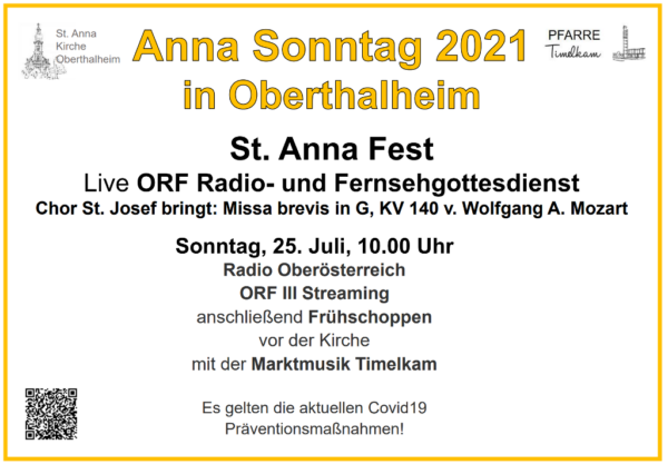 Am Sonntag, 25. Juli überträgt der ORF aus der St. Anna-Kirche in Oberthalheim, Pfarre Timelkam, den Festgottesdienst zum „Annafest“ sowohl im Rundfunk als auch im Fernsehen live.