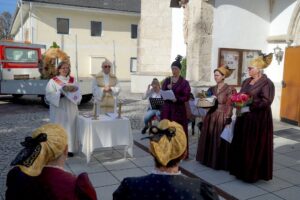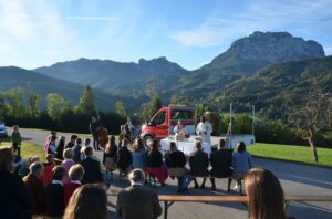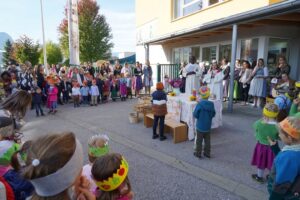 Die Gaben zum Erntedank wie Brot, ein Korb, diesmal mit zerstörten Früchten, blattlosem Zweig, gebrochenen Dachziegeln und Coronamaske, dass an das schwere Hagelunwetter und an die Coronazeit erinnern soll und einem Blumenstrauß, der die Schönheit der Natur zeigt, wurden durch anwesende Bewohner dargebracht. Beim Kindergarten Gschwandt warteten schon sehnsüchtig eine große Schar an Kids mit selbstgebastelten Kronen samt Eltern, Nachbarn und Freunde auf das Eintreffen der Erntekrone. Die Freude war dann sicht,- und hörbar und für Alle ein besonderes Erlebnis.