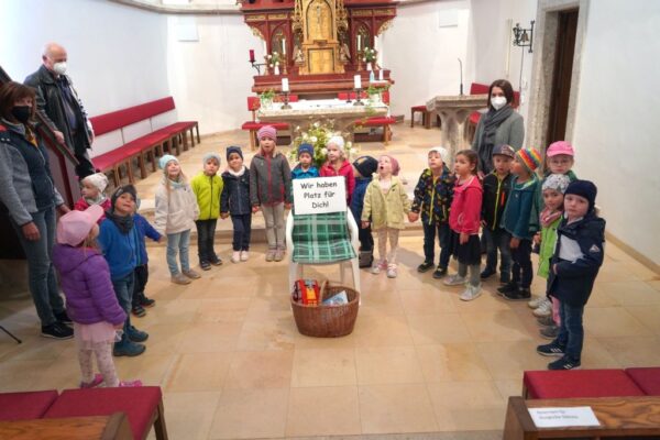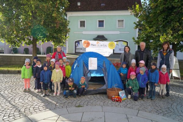 Und viele Bewohner und Besucher in der Umgebung von Gschwandt konnten sich zwischen 9:00 und 21:00 Uhr davon überzeugen. Auch eine Gruppe des Caritas Kindergarten Gschwandt war gekommen und brachte einen Korb mit Spenden in Form von Spielsachen und Bücher aus ihrem Spielzeugschatz mit. Josef GRUBER saß inmitten der Kinderschar und erklärte in beeindruckender Weise den Kleinen die Situation von flüchtenden Kindern, denen das Lachen, sei es durch Verlust der Eltern, durch Härte, Kälte, ihrer spärlichen Spielsachen und unvorstellbaren Qualen vergangen ist. Ein sehr berührender Moment, der am Schluss mit Applaus der Kinder endete.