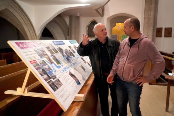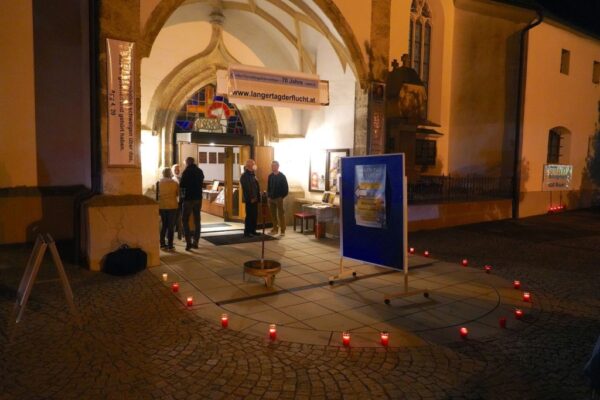 Zur Stärkung gab es in der Kirche zur freien Entnahme Süßigkeiten aus aller Herren Länder und eine PowerPoint Präsentation zum Thema lief im 30 Minuten Takt auf einer großen Leinwand vor dem Altar. Erworben konnte auch das Buch „WIR“ der Migrationsforscherin Dr. Judith KOHLENBERGER werden. Am Abend brannten dann Fackeln und Lichter vor der Kirche, um auf die aktuell „brennende“ Situation aufmerksam zu machen. Als besondere Überraschung kam auch Ryad Saleh-Hamade, der mit seiner Familie nach der Flucht eine Weile im Pfarrheim Gschwandt wohnte vorbei und blickte nochmals mit Josef Gruber auf die Schautafel seiner Geschichte zurück. Sichtbar betroffen entzündete er vor dem aufgestellten Zelt am Kirchenplatz eine Gedenkkerze. Die Pfarre Gschwandt bedankt sich für die großzügigen Spenden für Menschen auf der Flucht und regen Besuch beim Tag der langen Flucht in und vor der Pfarrkirche Gschwandt.