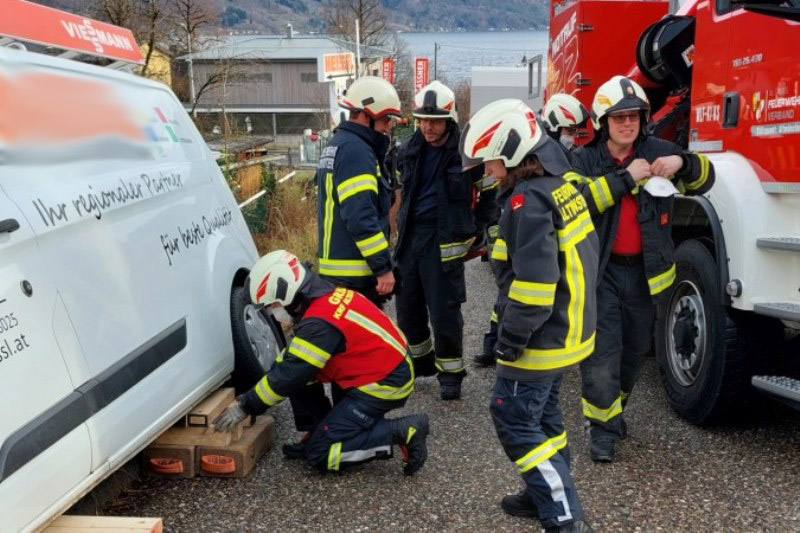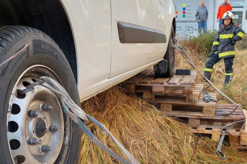 „Wir wurden zur Bergung alarmiert und konnten unter Zuhilfenahme von reichlich Pölz Material, Holzpaletten und des Kranes unseres WLF, das Fahrzeug wieder auf die befestigte Fläche bringen“, so die Feuerwehr.