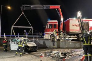Zur Unterstützung der Fahrzeugbergung alarmierte die Einsatzleitung die FF Lindach mit deren Wechselladefahrzeug. Das auf der Betonwand stehende Fahrzeug wurde mit deren Kran anschließend beseitigt. Die Feuerwehren konnten nach ca. 2 Stunden wieder in deren Feuerwehrhäuser einrücken. Im Einsatz standen 20 Einsatzkräfte.