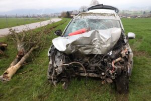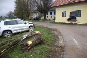 Ein PKW ist im Bereich einer Hofzufahrt frontal in ein Garagengebäude gekracht. Zuvor hat der PKW offenbar noch einen Baum gefällt. Die Einsatzkräfte konnten den Kleinbrand rasch unter Kontrolle bringen. Der PKW wurde aus der Garage gezogen. Ein in der Garage geparkter PKW wurde ebenfalls totalbeschädigt.