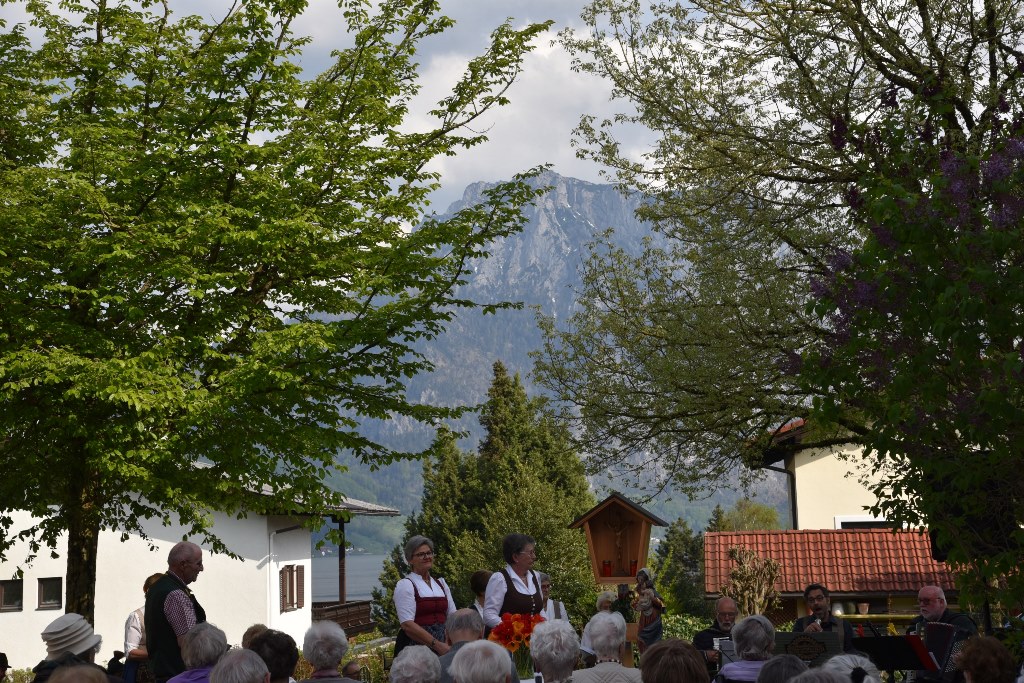 Die Goldhaubenfrauen Altmünster haben am Freitag, den 5. Mai, eine Maiandacht im Park des Altenwohnheims organisiert. Die Veranstaltung bot dabei einen sagenhaften Blick auf den Traunstein.